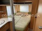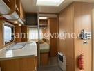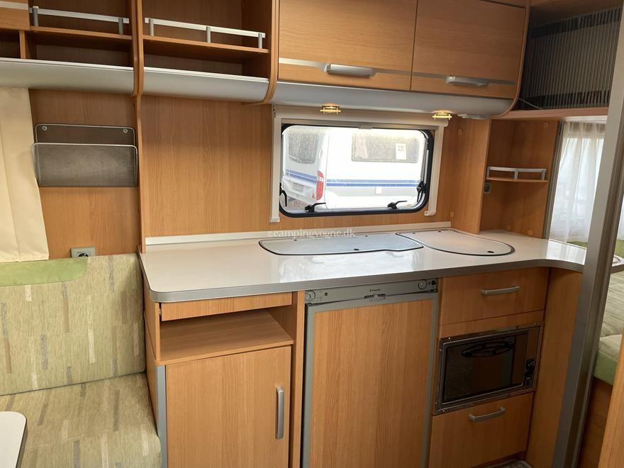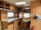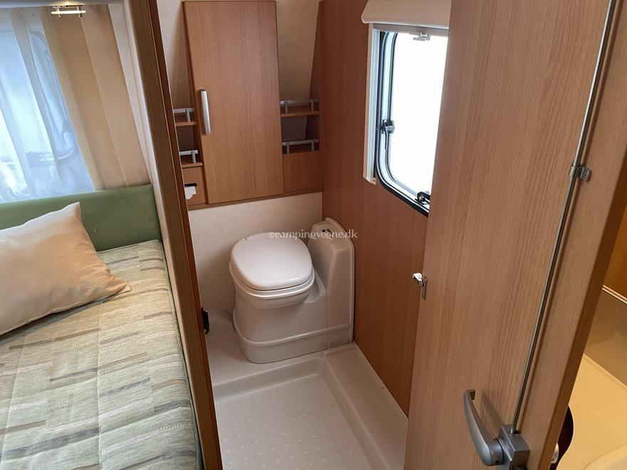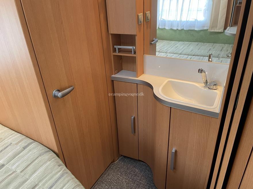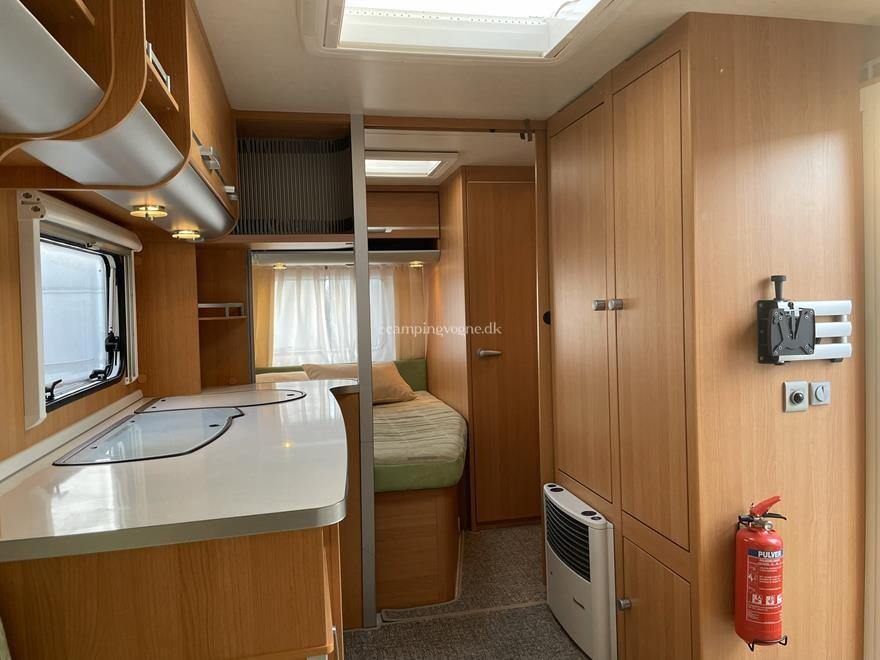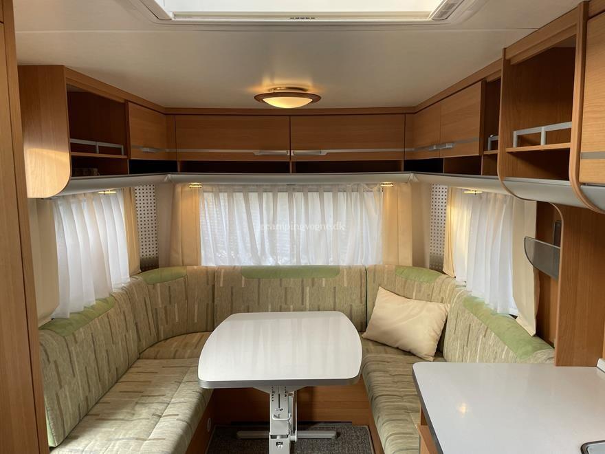Vognen er indrettet med en rundsiddegruppe i bagenden, dernæst køkken med køleskab og gasbageovn, overfor dette er klædeskab og tv-holder til fladskærm, forrest i vognen er en god dobbeltseng, samt vask og toiletrum med brusebund.