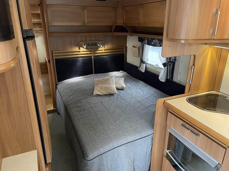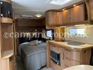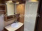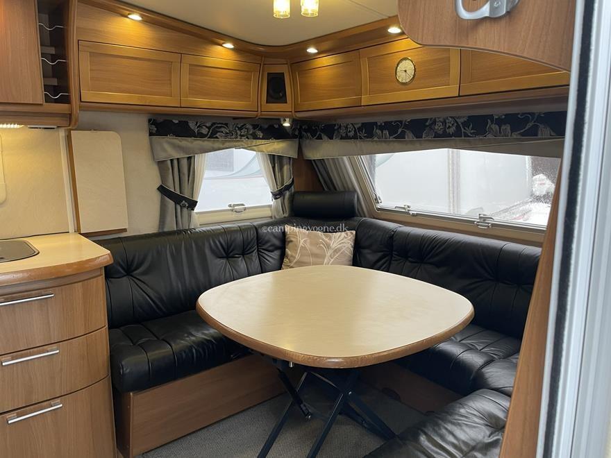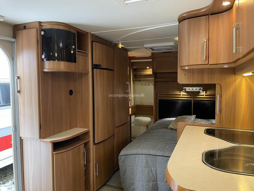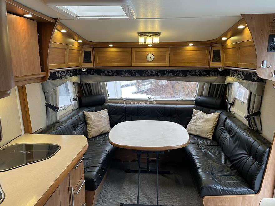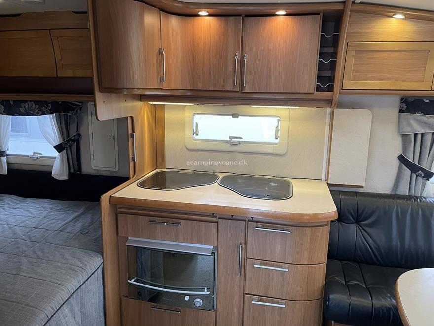 Yderst vogn med stor rundsiddegruppe i læder og endebadeværelse med bruseniche. Midt i vognen findes køkken med gasbageovn, højt køleskab og god skabsplads.