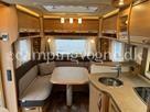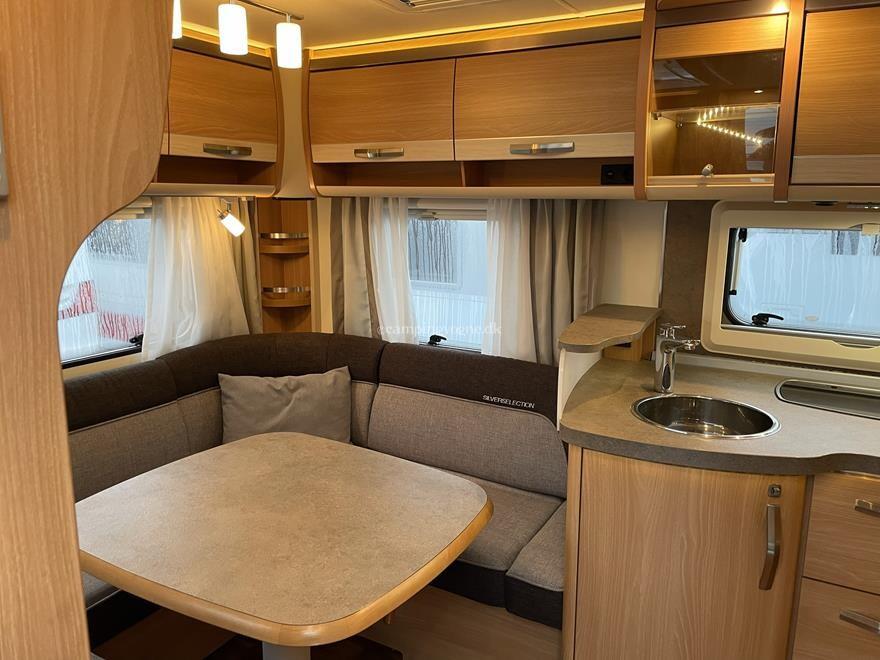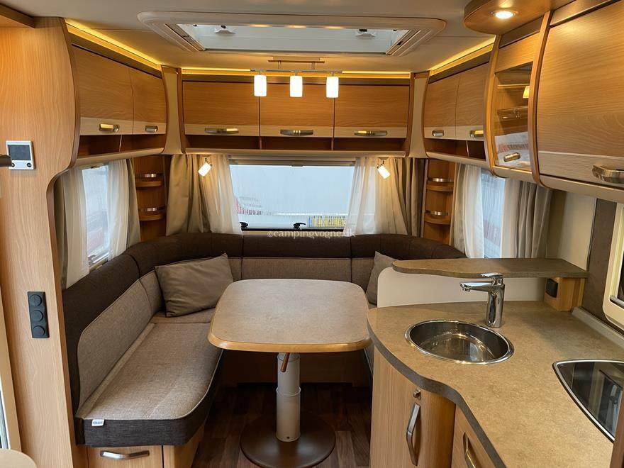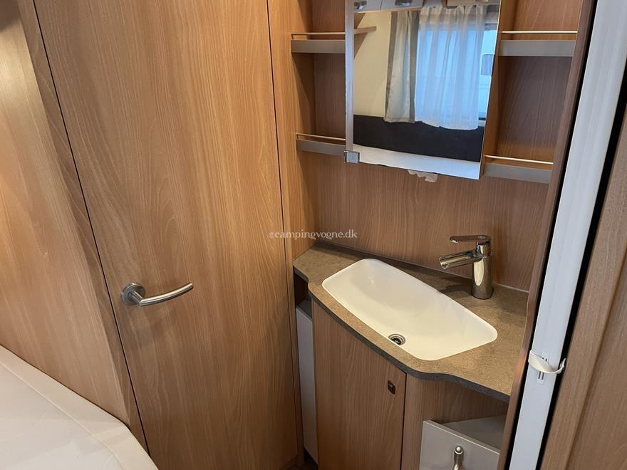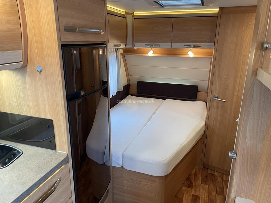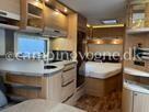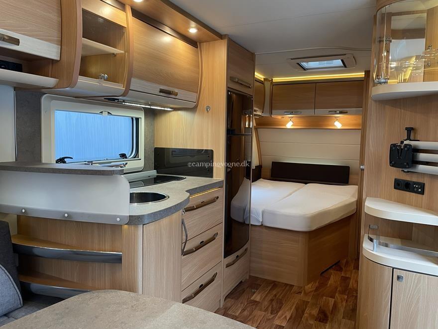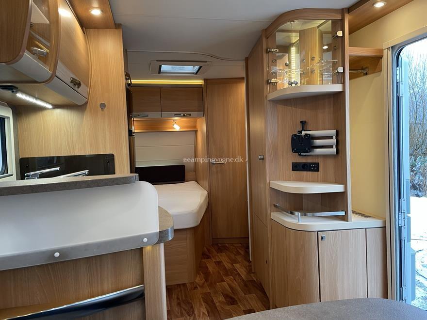 Vognen er indrettet med rundsiddegruppe i bagenden, køkken og skabsplads i midten, samt fransk seng, toilet og bad i forenden.