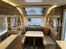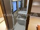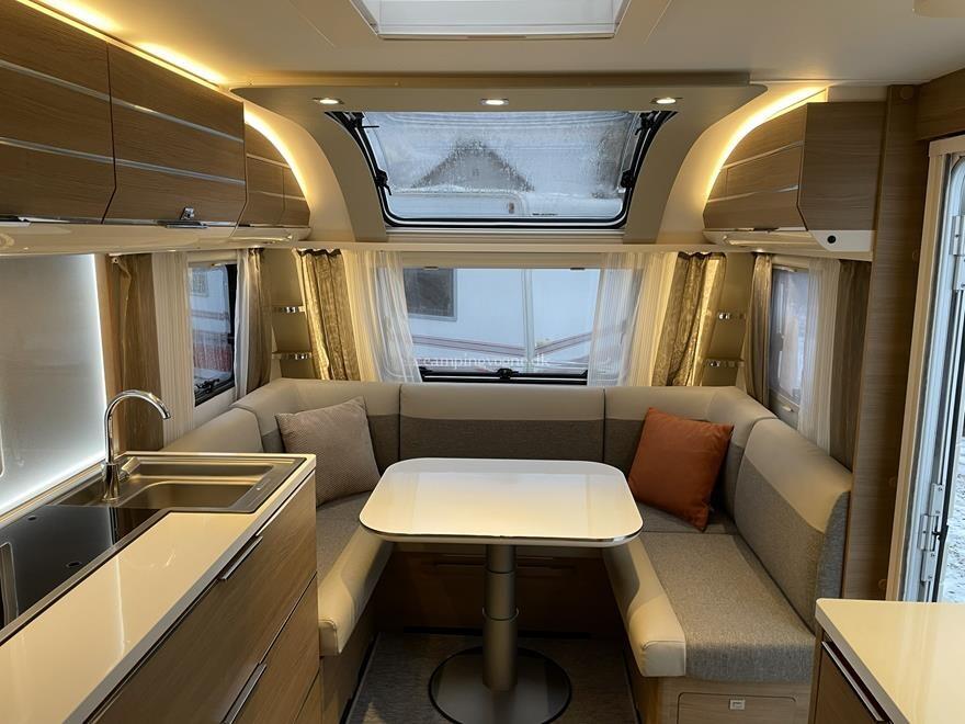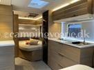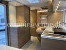 Vognen er indrettet med en stor rundsiddegruppe i forenden. I midten køkken i pæn størrelse med højt køleskab og emhætte. Overfor godt med skabsplads.