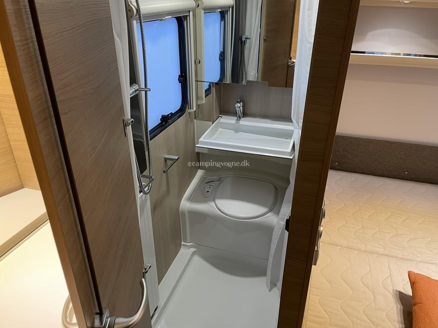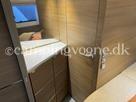 Bagenden af vognen er indrettet med fransk seng samt toilet, klapvask, brusebund og bruser.