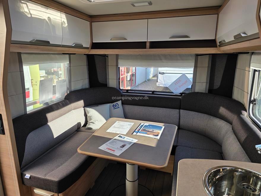 Super flot vogn i stilrent gråt udvendigt design indrettet med god siddegruppe i bagenden. Herefter godt køkken med højkøleskab overfor klædeskab. I forenden soveafdeling med dobbeltseng og toiletrum med brus. Pris standard 255.200. Denne vogn er bestilt med Truma gasboiler 6.990, ekstra serviceklap foran 2420, oplukkeligt vindue i fronten 4520, Knaus komfortseng 6.030, Byvand 3.030, Thule tagmonteret markise i antracit grå 13.080.-. Pris ialt 291.270.-