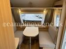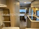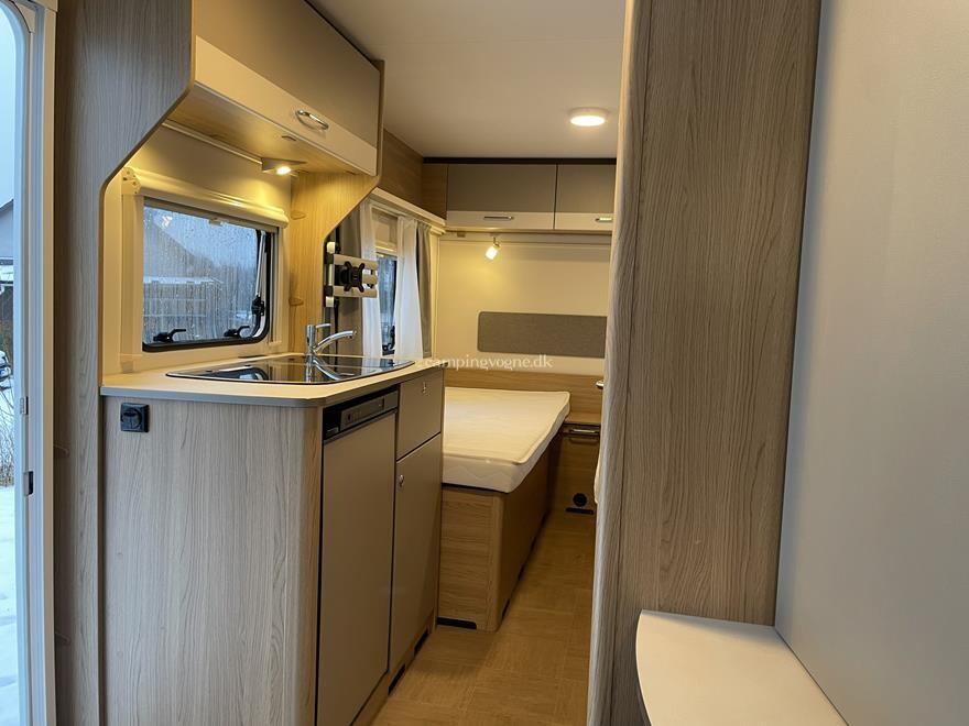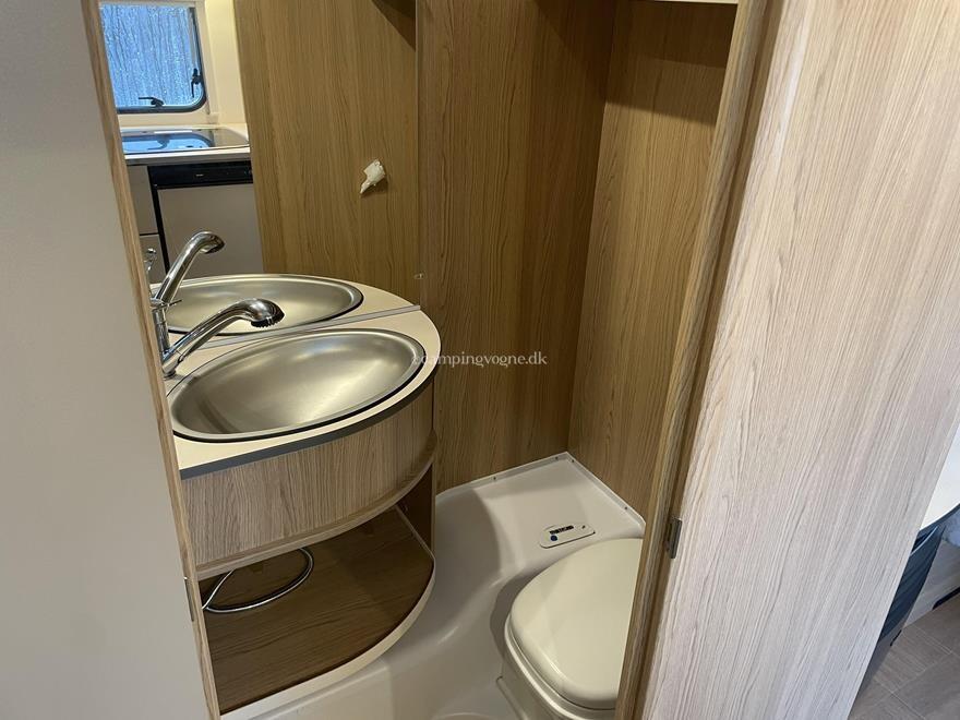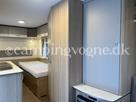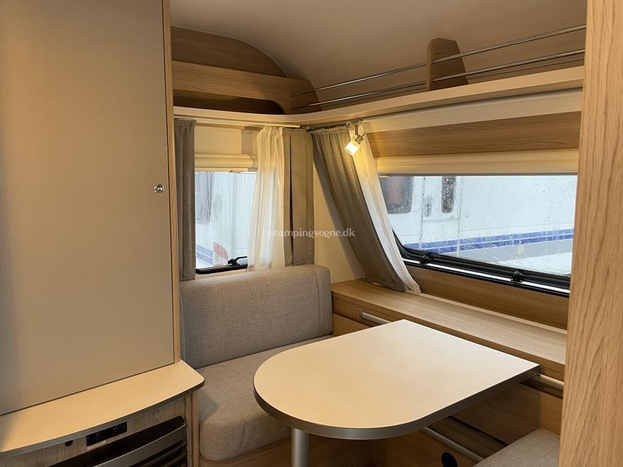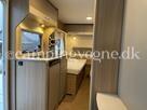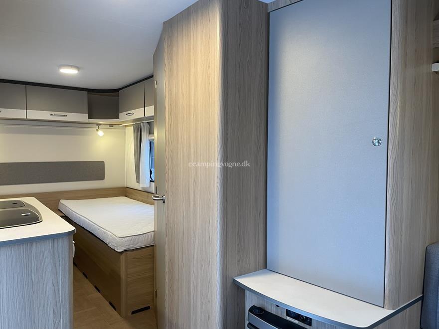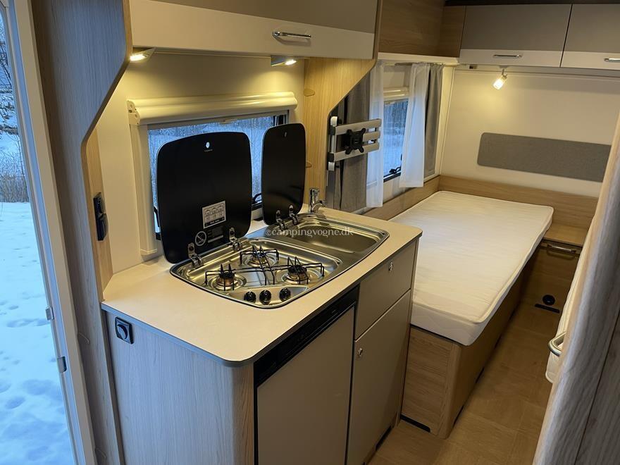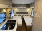 En super fin rejsevogn for to indrettet med siddegruppe i forenden. Herefter køkken overfor klædeskab og toiletrum. I bagenden soveafdeling med to enkeltsenge.