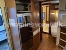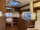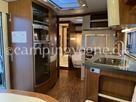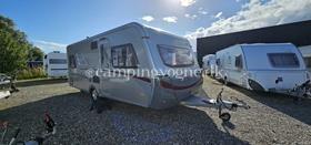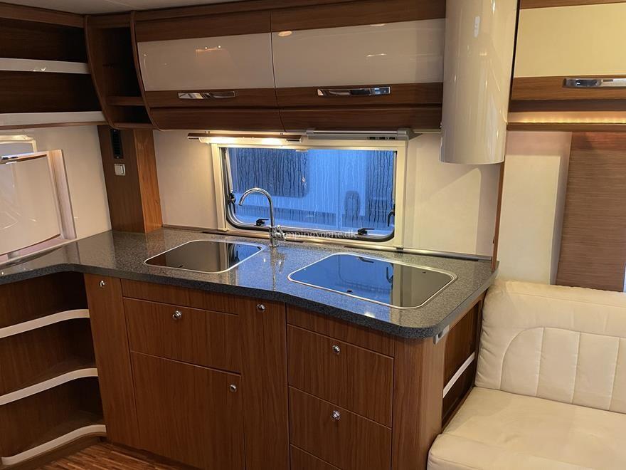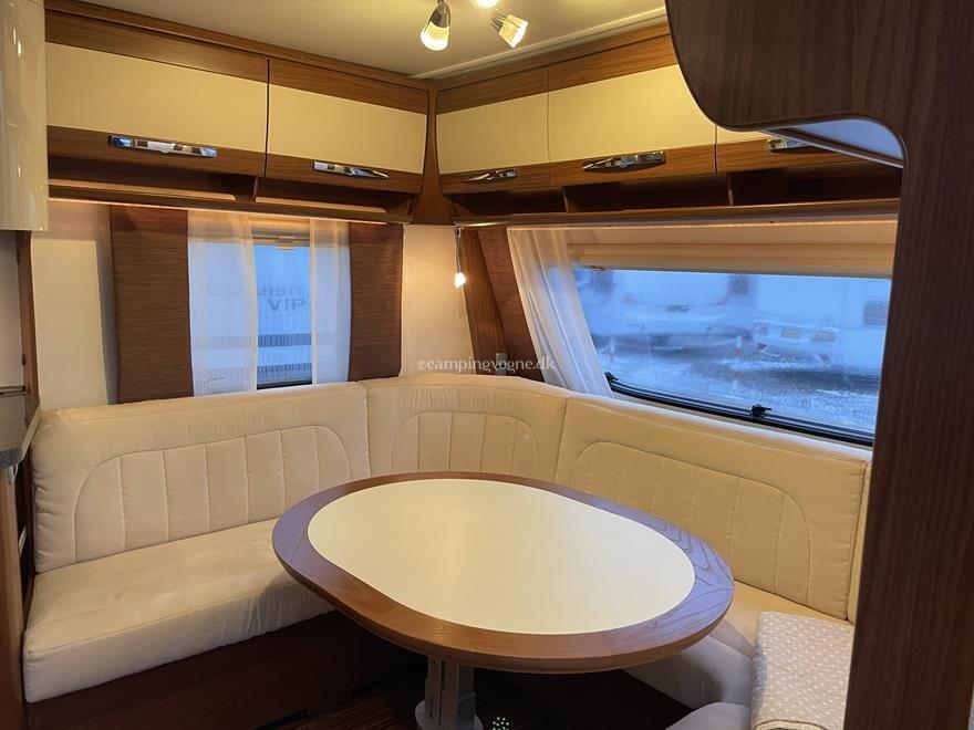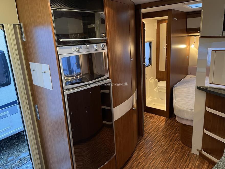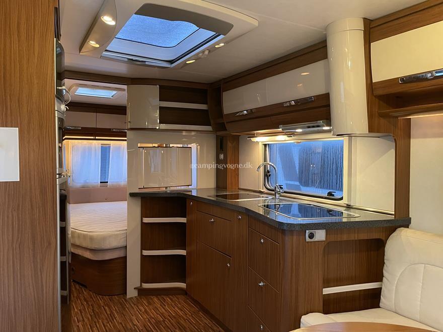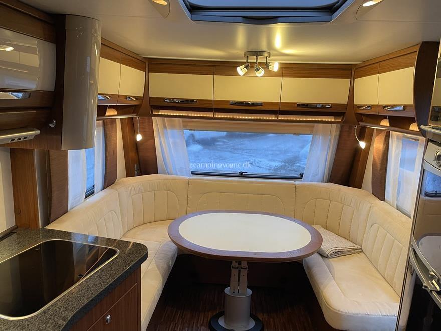 Dejlig rummelig vogn indrettet med stor rundsiddegruppe i forenden, Herefter godt køkken med god bordplads, overfor dette er dobbelt klædeskab og stort køleskab med gasbageovn. I bagende soveafdeling med dobbeltseng, vaskearrangement og toiletrum.