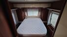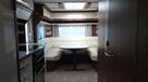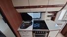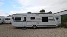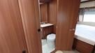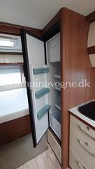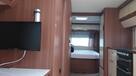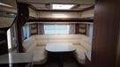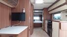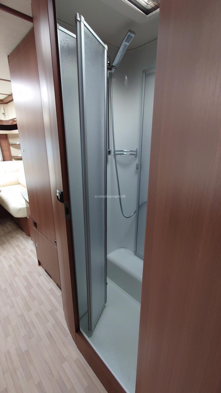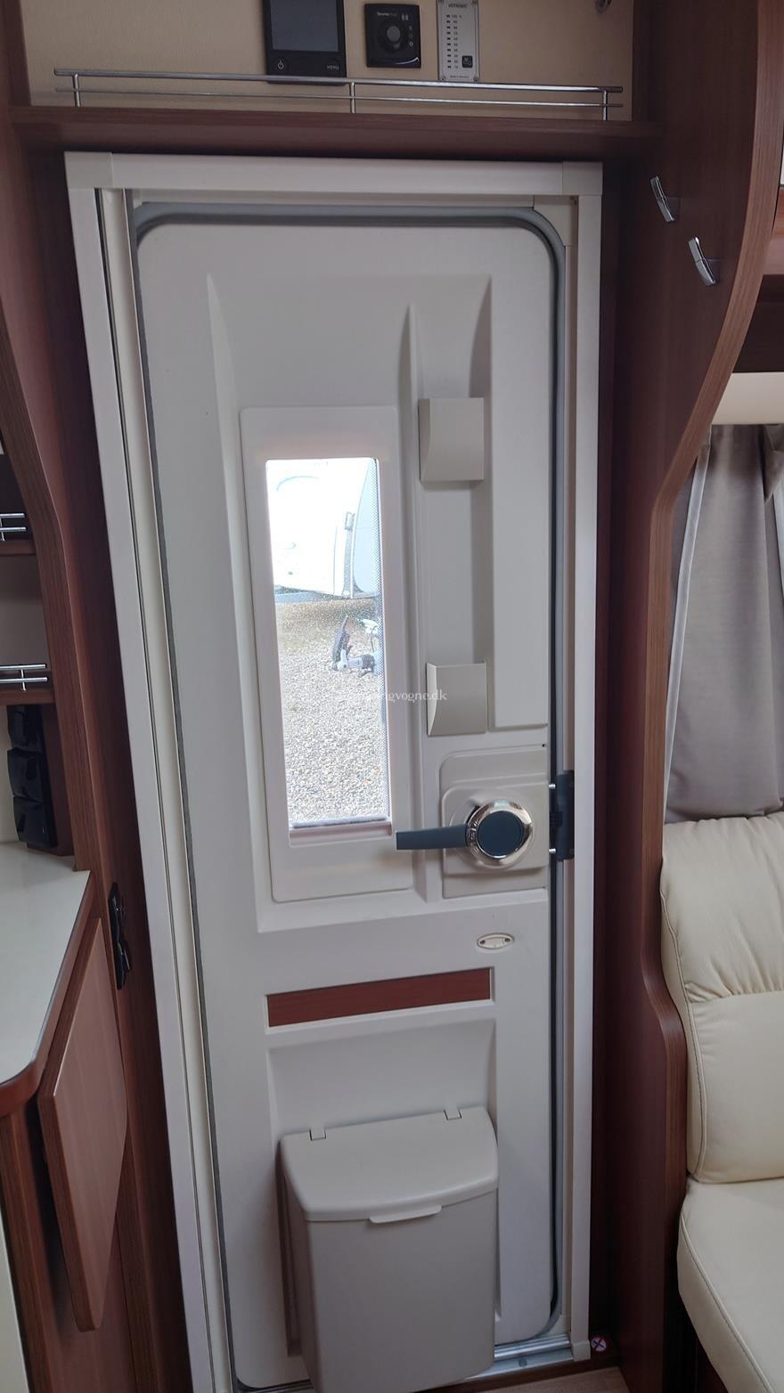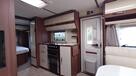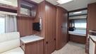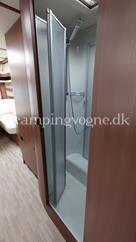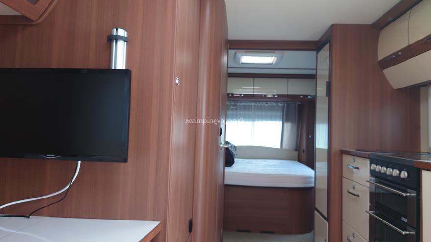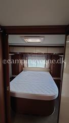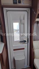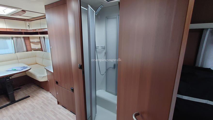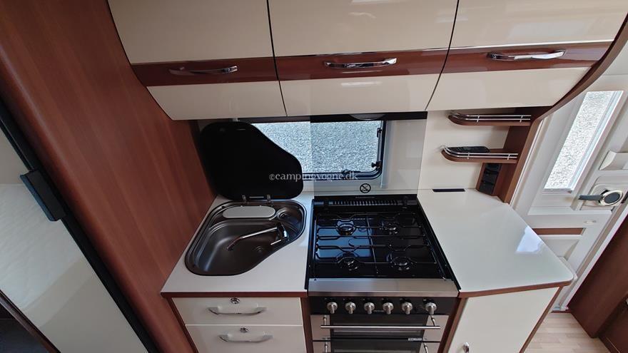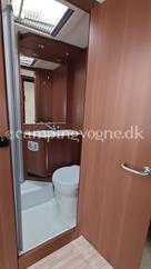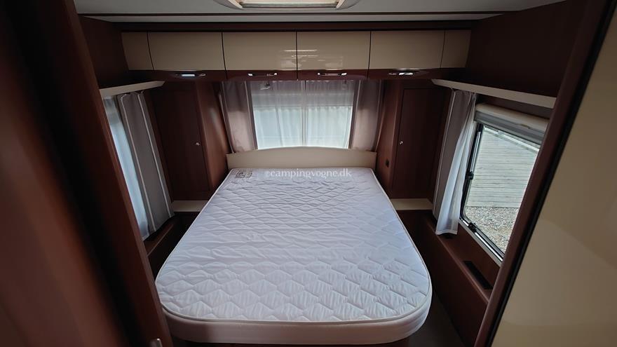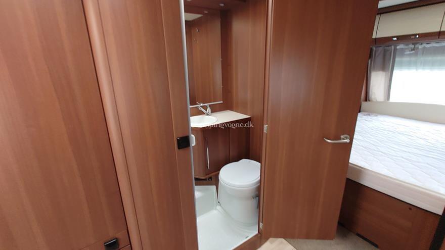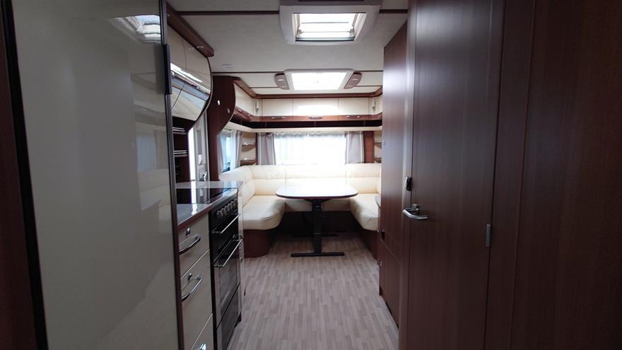 Flot vogn indrettet med sofagruppe og tv-bord i bagenden. Herefter funktionelt køkken med komfur, gasbageovn og sort slimline køleskab. Overfor klædeskab og toiletrum med brusemulighed. I forenden lækker soveafdeling med midterstillet dobbeltseng og panoramavinduer.