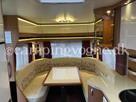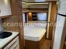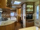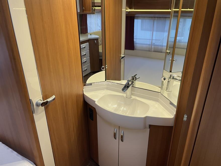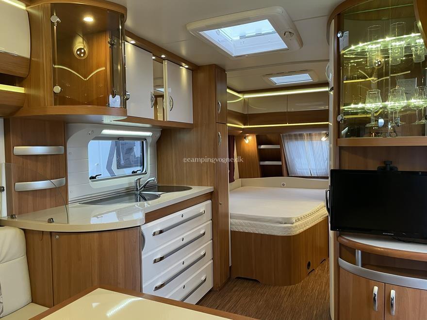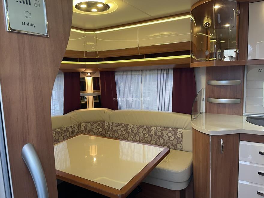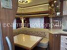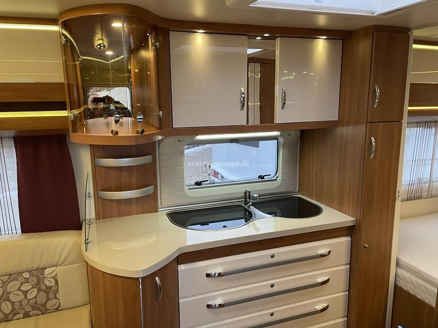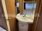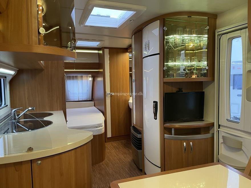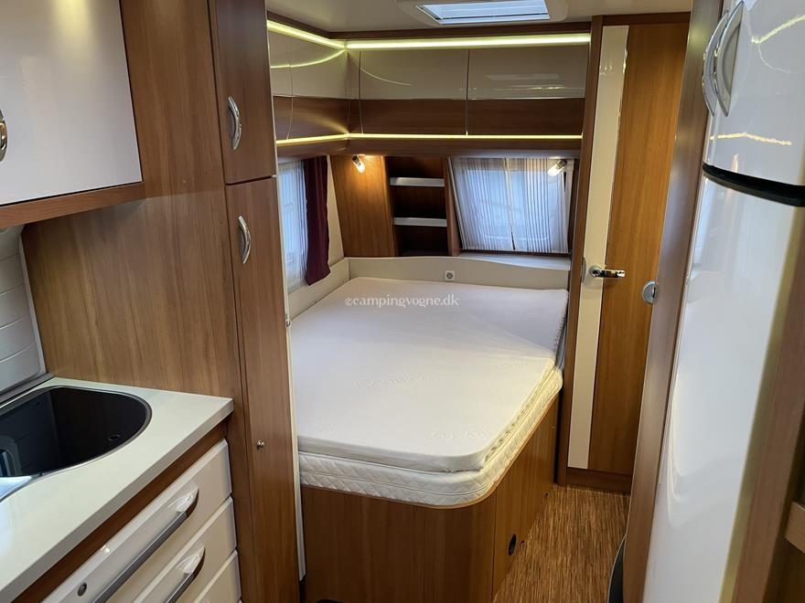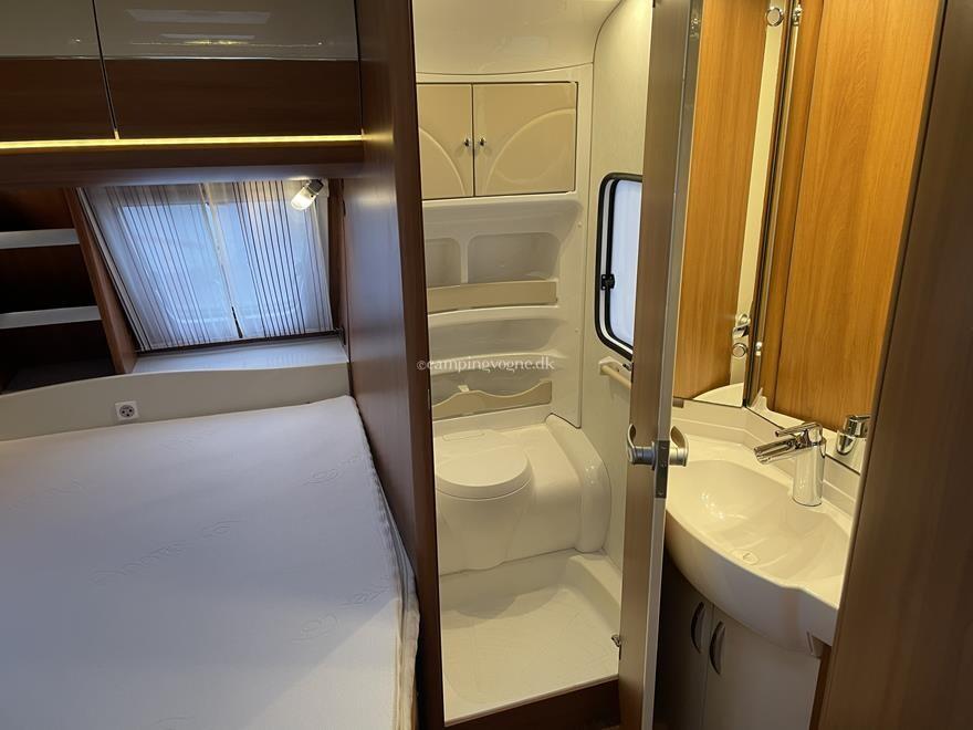 Vognen er indrettet med en hyggelig rundsiddegruppe i bagenden, dernæst køkken med gode opbevaringsløsninger samt klædeskab overfor, Forrest i vognen er en fransk dobbeltseng, håndvask og et toiletrum med bruser.