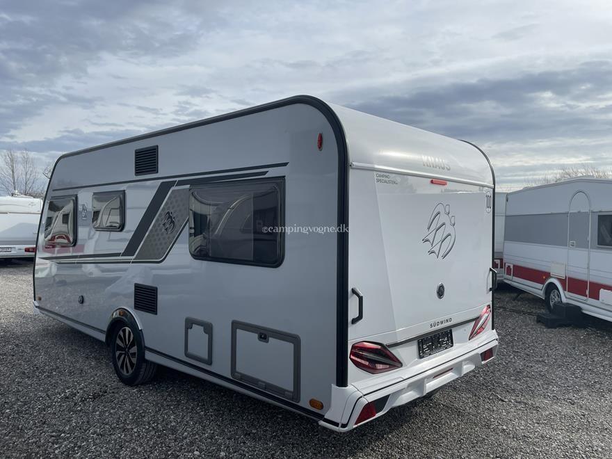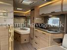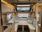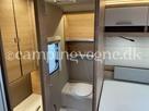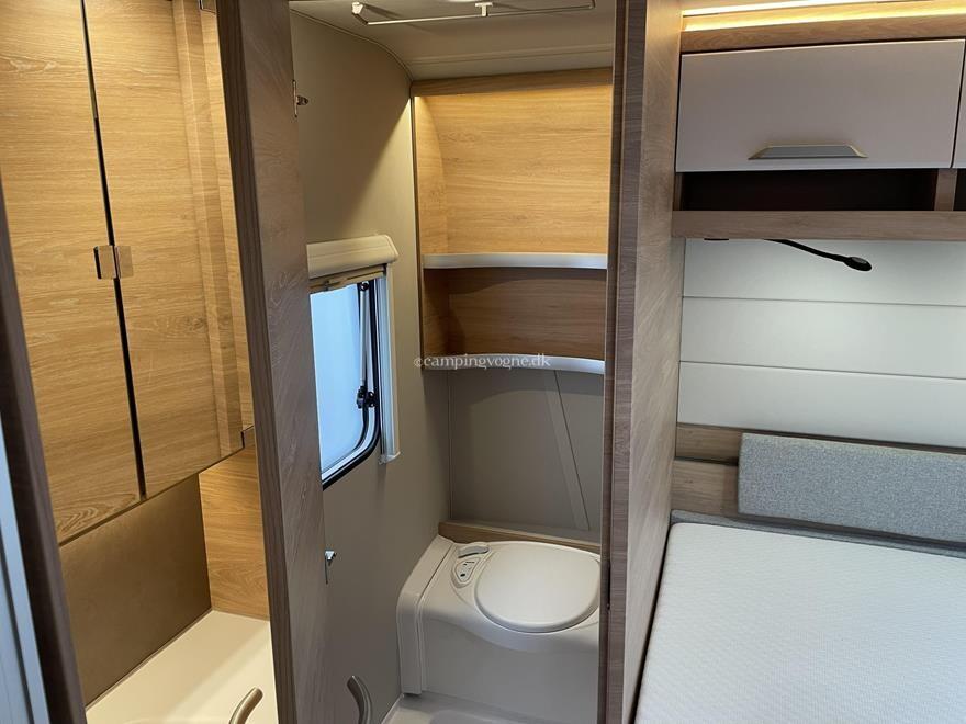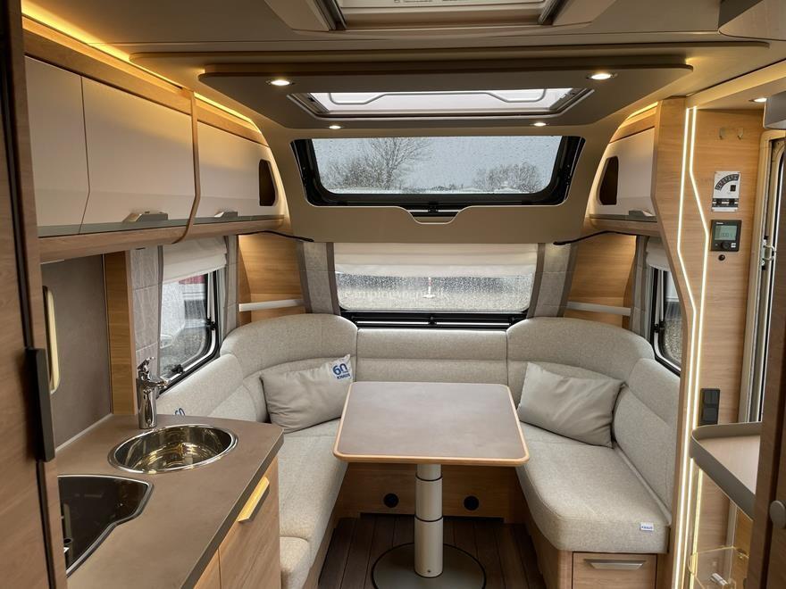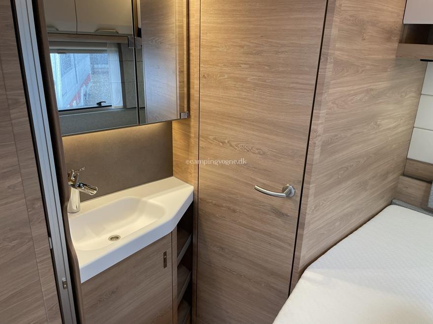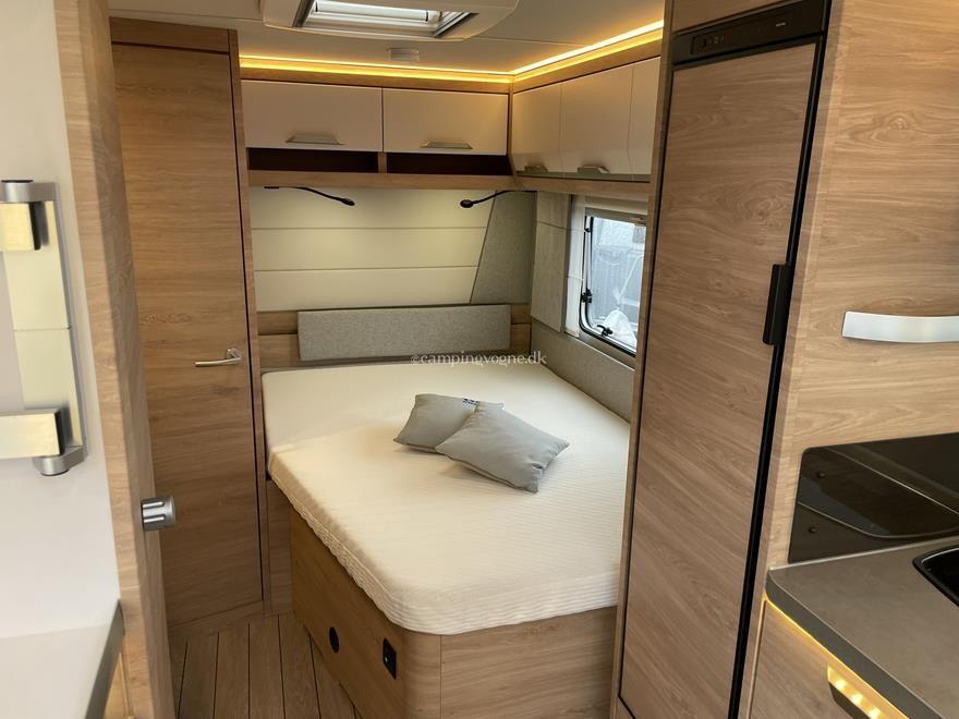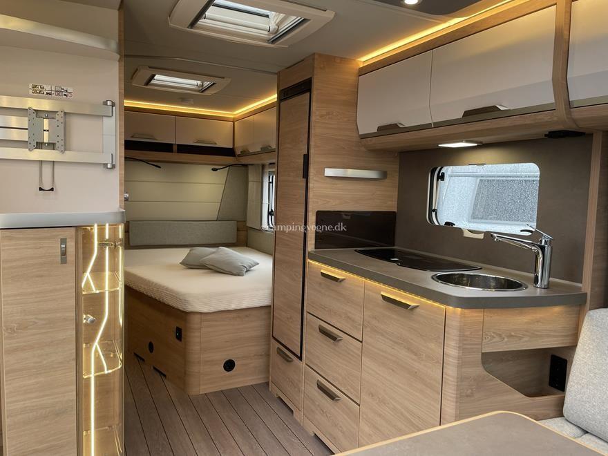 Vognen er indrettet med en hyggelig rundsiddegruppe i forenden, derefter køkken med stort slimline køleskab, Overfor det er klædeskab, bagerst i vognen er en fransk dobbeltseng og vask, samt toiletrum.