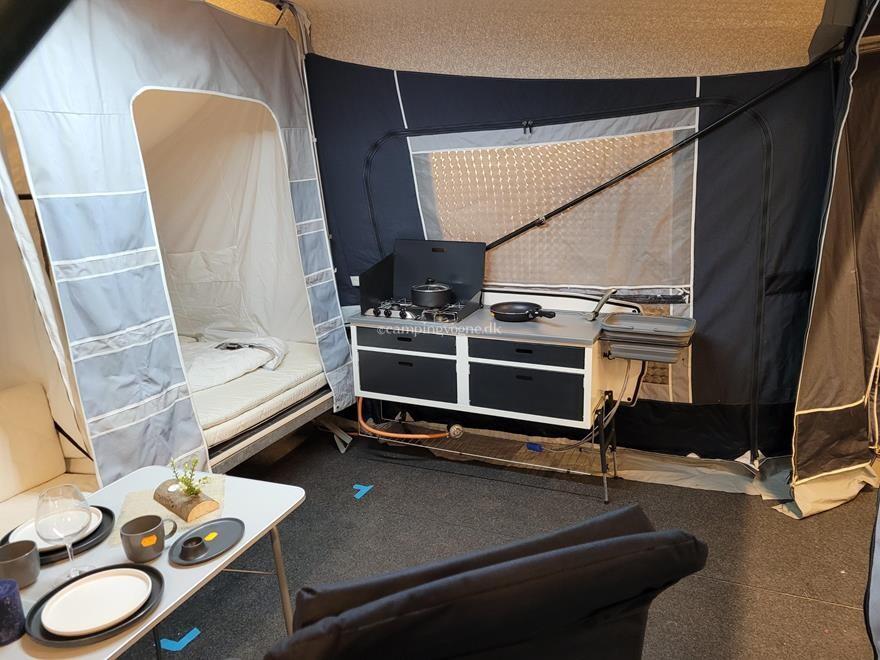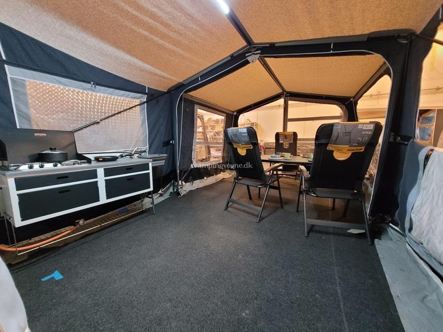Fortelt Premium Komplet - De Luxe Køkken med 3 Gas blus og Vask - Alu Sports Fælg - Næse Hjul -Resv hjul under vogne med holder - Køre Kappe - Hjælpe Støddæmper - Tag Bagagebære Alu - Stor Front