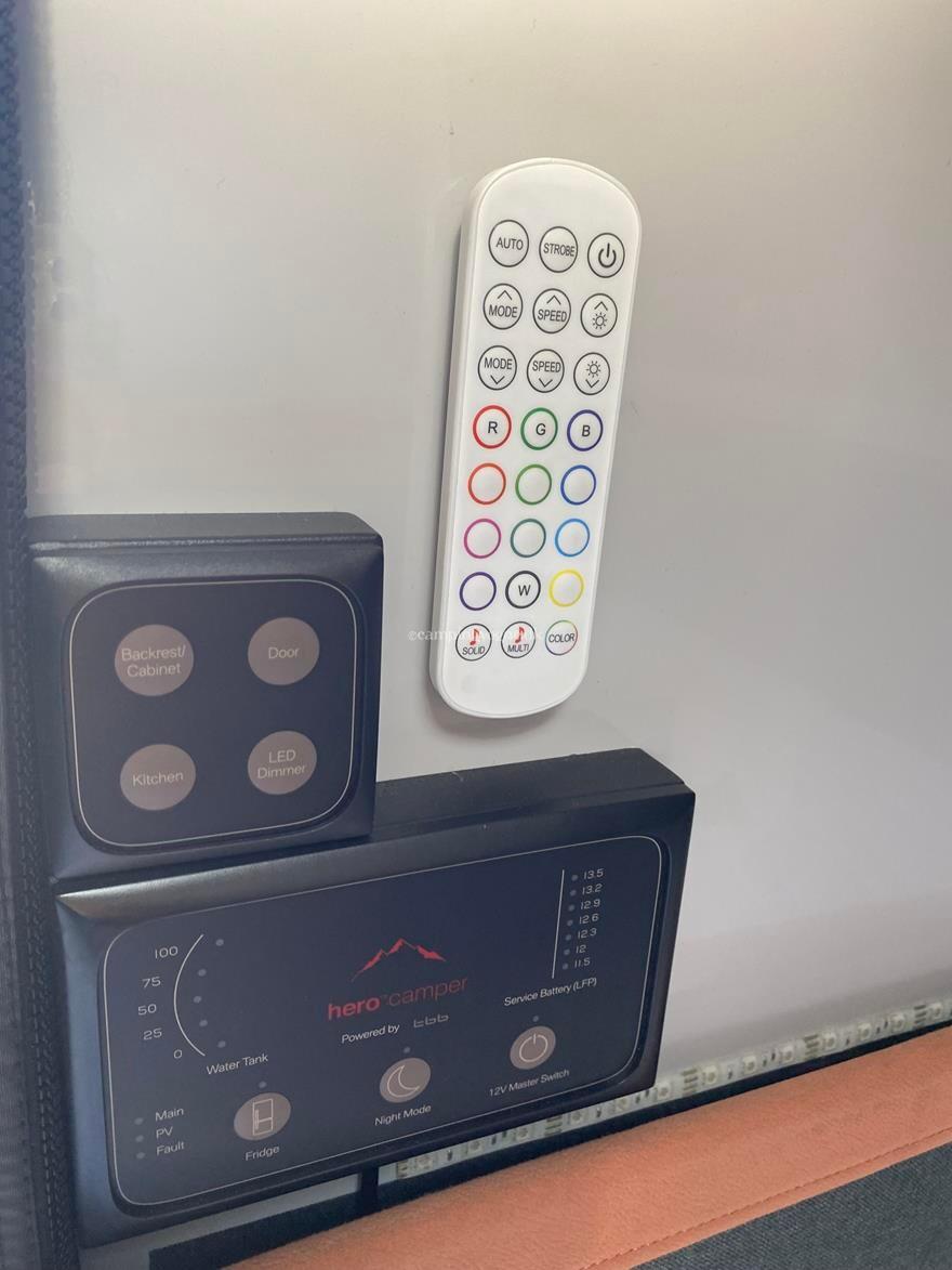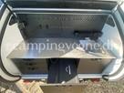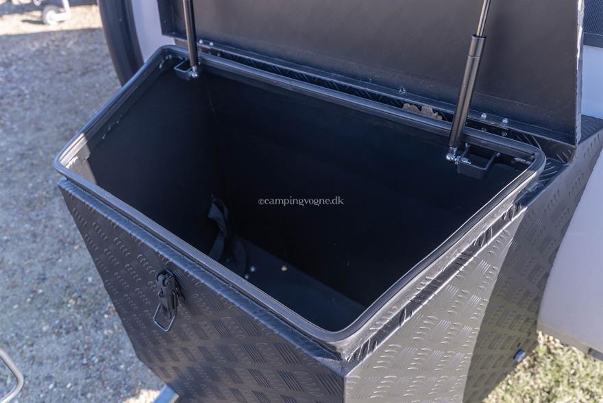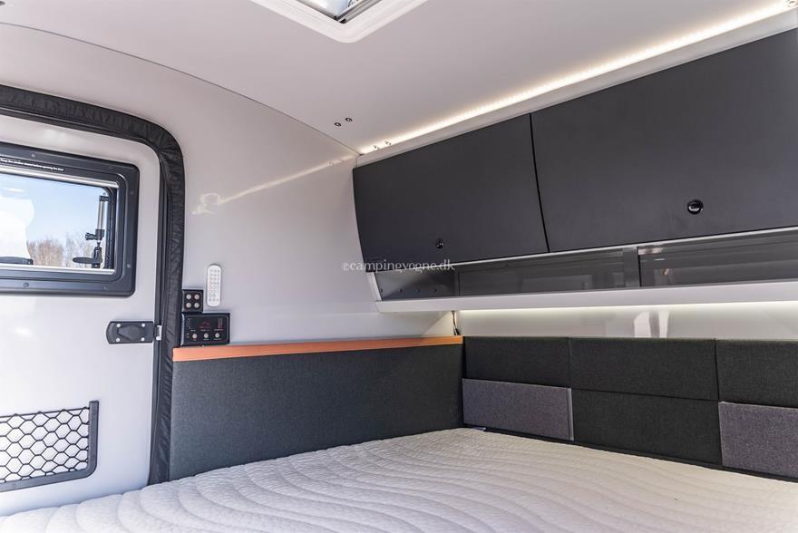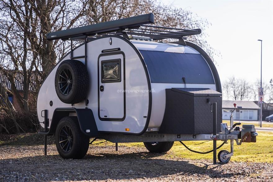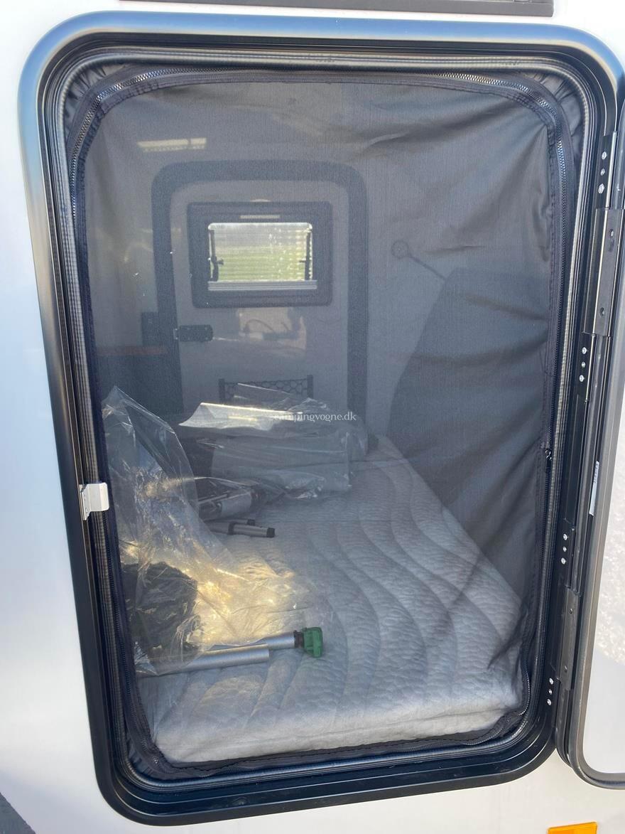 Markise med Sider og Front - Køkken med Køleboks / Vask / Skabe / Indbygge vand Tank / Køkken Telt - Dobbelt seng med Top Madras - myggenet i vinduer i døren - Sol celle anlæg - 105 AH Lethium Batteri - Tagluge med myggenet - Tag bagagebære - Vogn er vejet ned til 1000 kg total - Rev hjul med alu fælg - Alu fælg - Næse hjul