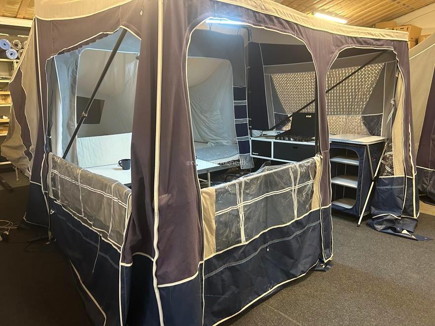 Øvrige oplysninger: Hjælpe Støddæmper - Front solsejl - Køkken med 3 Gas Blus - Vask med vand Hane - Vand Dunk med Vand Pumpe - Front Boks - Køre Kappe - Bagagebær - Lomme stykke - Kuffer rum - Walk-IN Closet / Bøjle stang