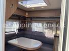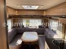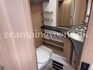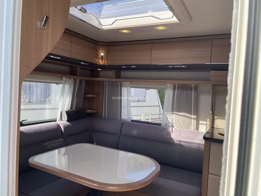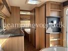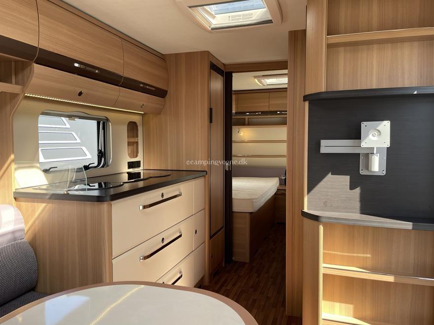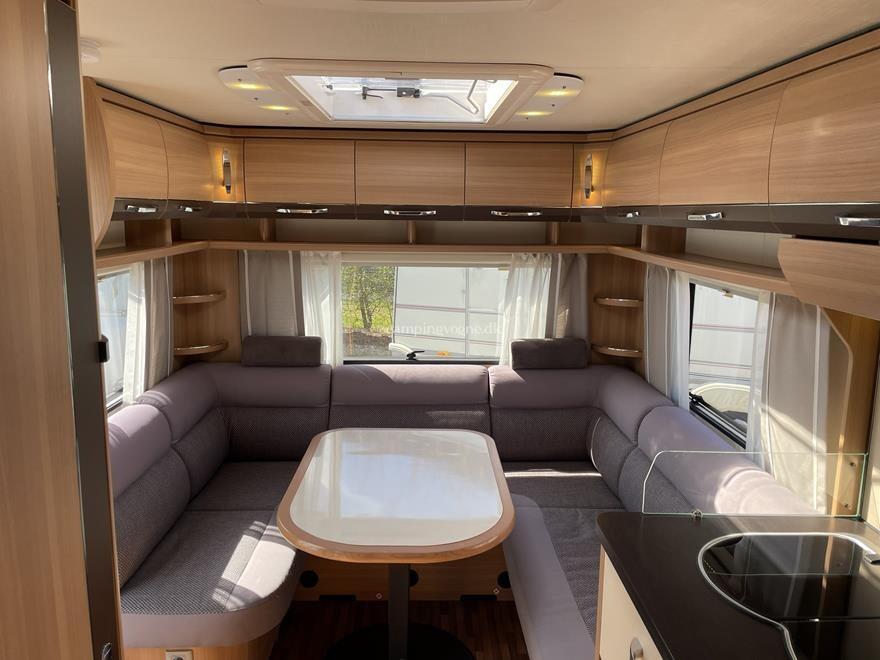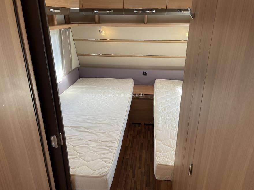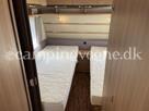 Vognen er indrettet med en hyggelig rundsiddegruppe i bagenden, Dernæst køkken og overfor dette er klædeskab og toiletrum, Forrest i vognen finder du soveværelset hvor der er 2 gode enkeltsenge med lameludtræk så der kan laves en stor bred dobbeltseng.