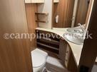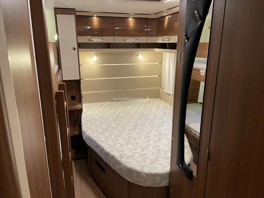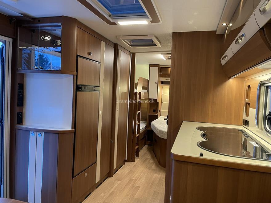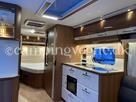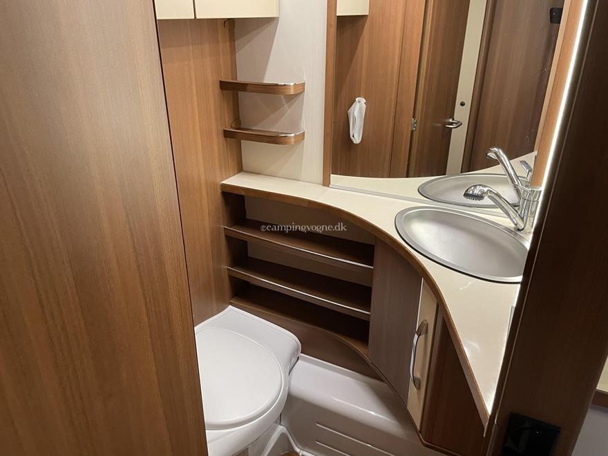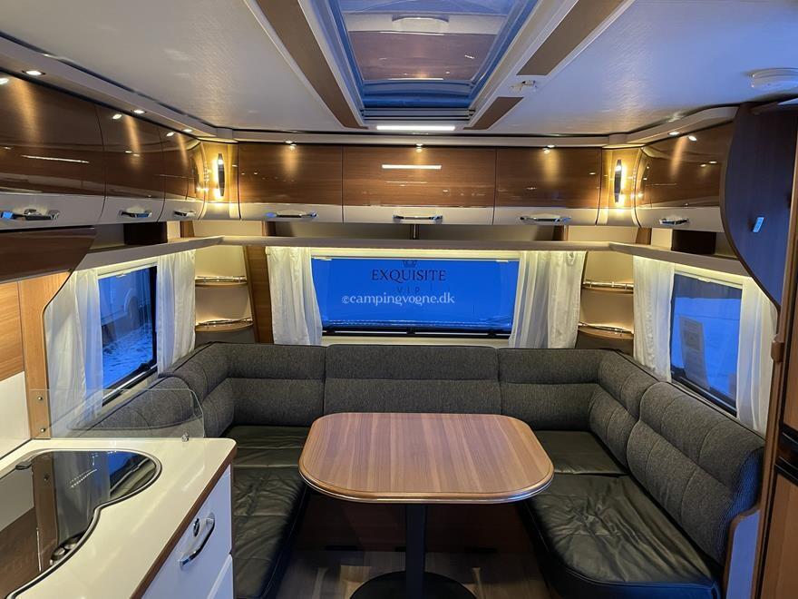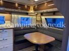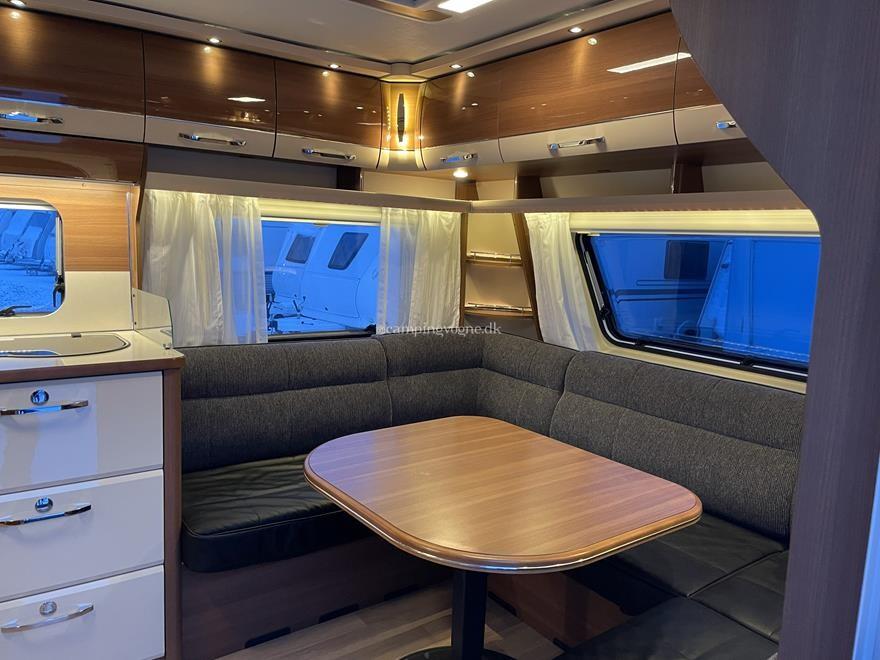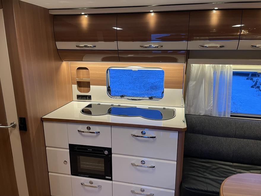 Vognen er indrettet med en ekstra stor og flot rundsiddegruppe i forenden. I midten finder du køkken med gasbageovn, overfor køleskab og god skabsplads.